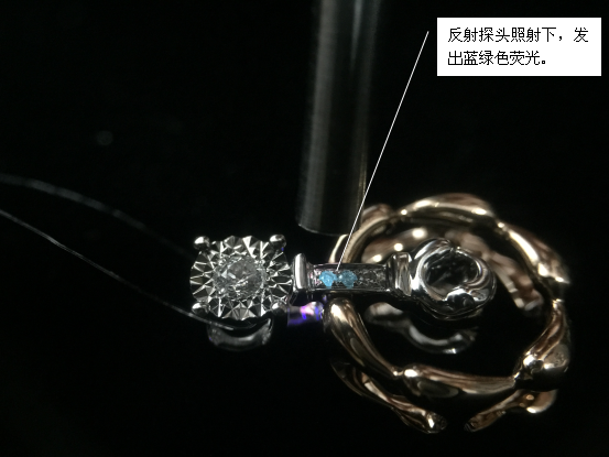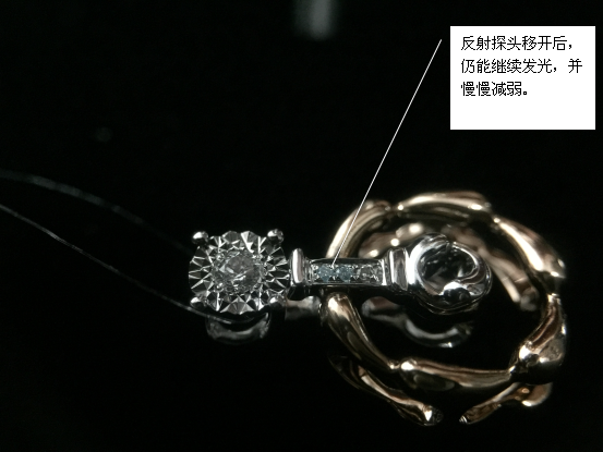 近期在使用紫外-可見(jiàn)光光譜儀對(duì)樣品進(jìn)行日常鑒定的過(guò)程中,發(fā)現(xiàn)配鑲的厘石碎鉆中有兩顆的熒光極強(qiáng)。而且,當(dāng)反射探頭離開(kāi)樣品的時(shí)候,出現(xiàn)了明顯的磷光現(xiàn)象點(diǎn)非常符合無(wú)色HPHT合成鉆石的特征。通過(guò)一步的檢測(cè)確認(rèn)這兩粒配石就是HPHT合成鉆石。