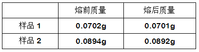 1. 通過試驗發(fā)現(xiàn),該足金吊墜熔融前后的質量、金含量變化甚微,說明該樣品由足金制成,未附著在有機物材質(如塑料、特種紙質等)基底上。