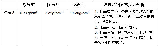 直接將樣品放入水中,由于較多的氣泡和較大的表面張力,樣品浮于水面,明顯與“金”的密度不符。經過一定的除氣操作,樣品沉入水底。由于氣泡多,數(shù)據(jù)測試不準。僅以樣品2的密度測試數(shù)據(jù)為例進行說明。